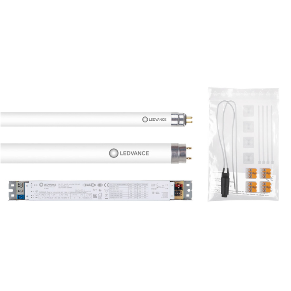 Gibt es keine Retrofit-Alternative oder stehen maximale Effizienz und geringer Wartungsaufwand im Fokus, ist Umverdrahtung die Lösung. Auch hierfür gibt es verschiedene Lösungen. Die perfekte Lösung zur Umstellung einer dimmbaren DALI-Installation auf dimmbare LED-Technologie ist das LED Tube External System aus LED-Röhre und externem Treiber – Ledvance.de/led-tube-external-system